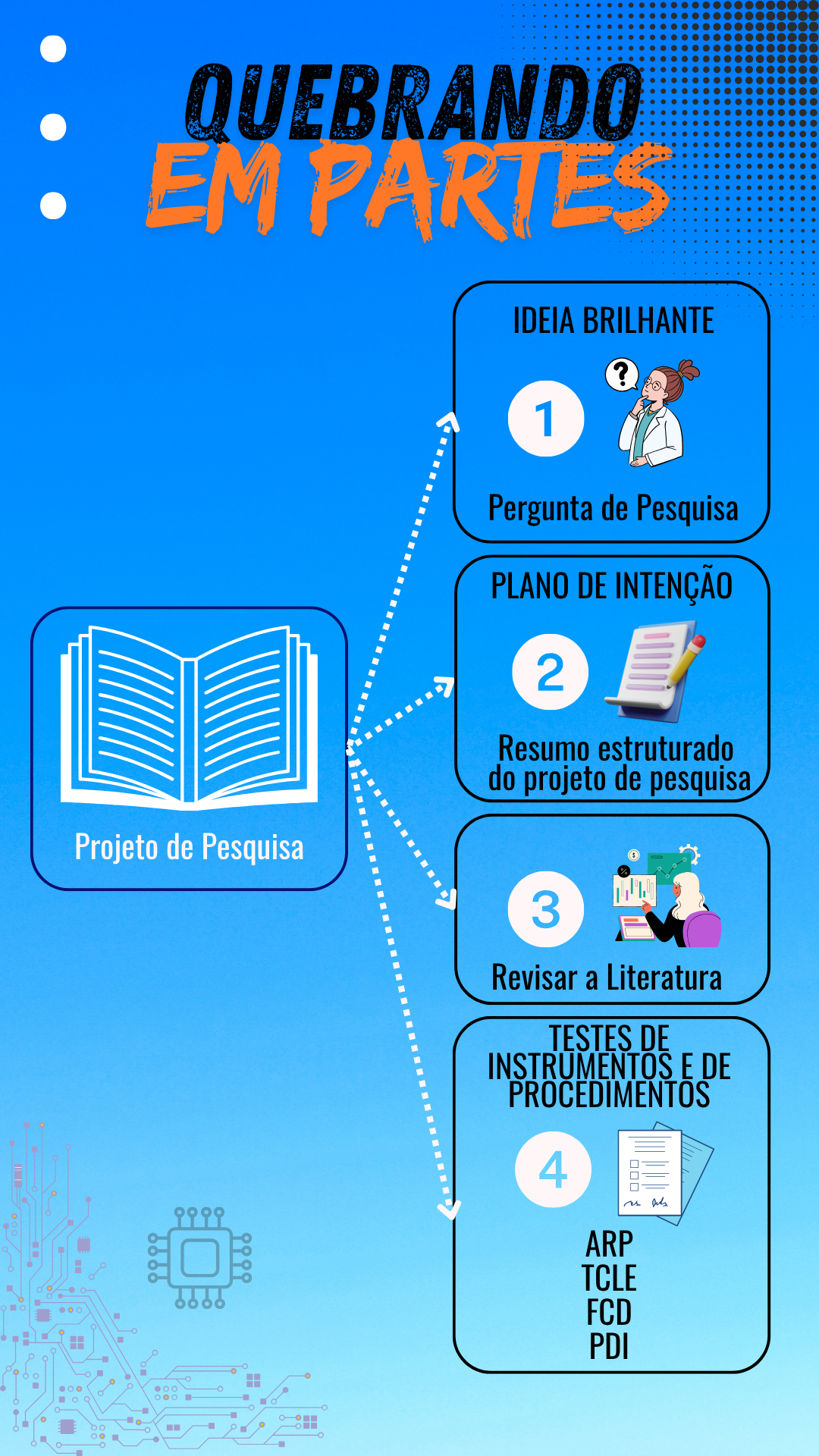 Pensar na elaboração do projeto como um grande quebra-cabeça pode ajudar a aliviar essa sensação de sobrecarga. Em vez de tentar montar tudo de uma só vez, o ideal é dividir essa tarefa em etapas mais simples e progressivas. Assim, começamos por formular uma pergunta de pesquisa clara e objetiva, que será o ponto de partida. Depois, elaboramos um plano de intenção (resumo estruturado do projeto), que ajuda a visualizar o caminho a seguir.