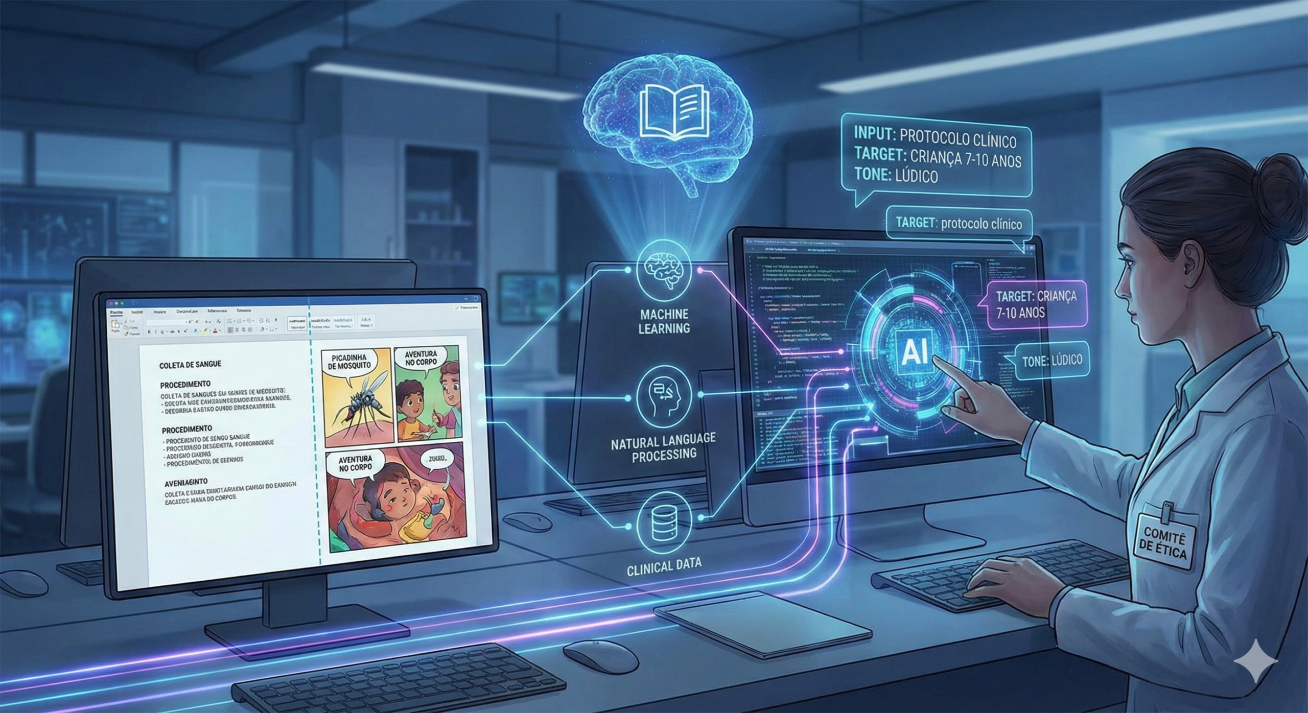 A inteligência artificial converte o TALE em histórias lúdicas, guiando crianças na pesquisa médica.