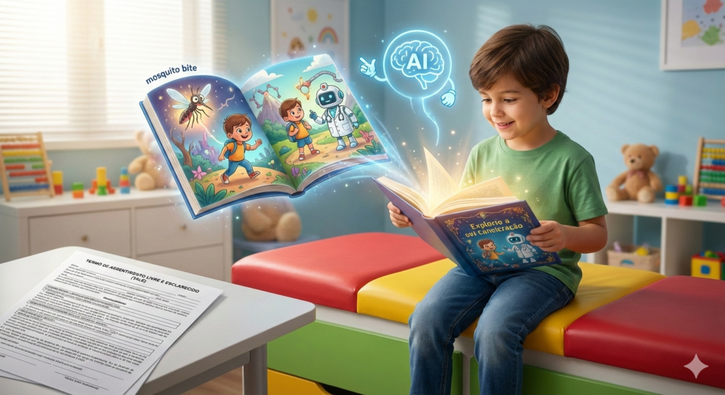 Crianças têm dificuldade em processar conceitos muito abstratos ou médicos. A inteligência artificial pode atuar como uma tradutora, convertendo procedimentos assustadores em analogias do dia a dia. Por exemplo, o termo técnico “coleta de sangue venoso periférico” pode ser transformado pela inteligência artificial em “uma picadinha rápida de mosquito no braço, para que a gente possa ver como você está por dentro”. Essa mudança de perspectiva reduz drasticamente o estresse pré-procedimento.