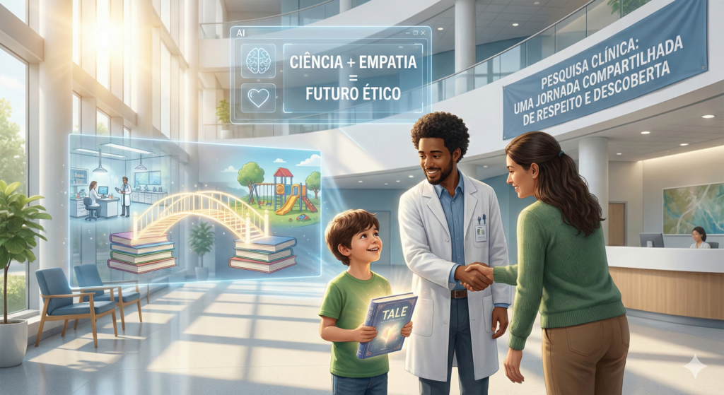 O TALE não precisa ser uma lista monótona de avisos. Ele pode ser transformado em uma grande aventura. Na narrativa criada pela inteligência artificial, a pesquisa clínica pode se tornar a “exploração de um grande mistério do corpo humano” ou a “busca por uma poção mágica para ajudar outras pessoas”. A inserção de personagens carismáticos, como um “Doutor Coelhinho” ou uma “Princesa Cientista”, ajuda a criar uma conexão emocional e imediata, fazendo com que a criança se sinta parte de uma equipe, e não apenas um sujeito de testes.