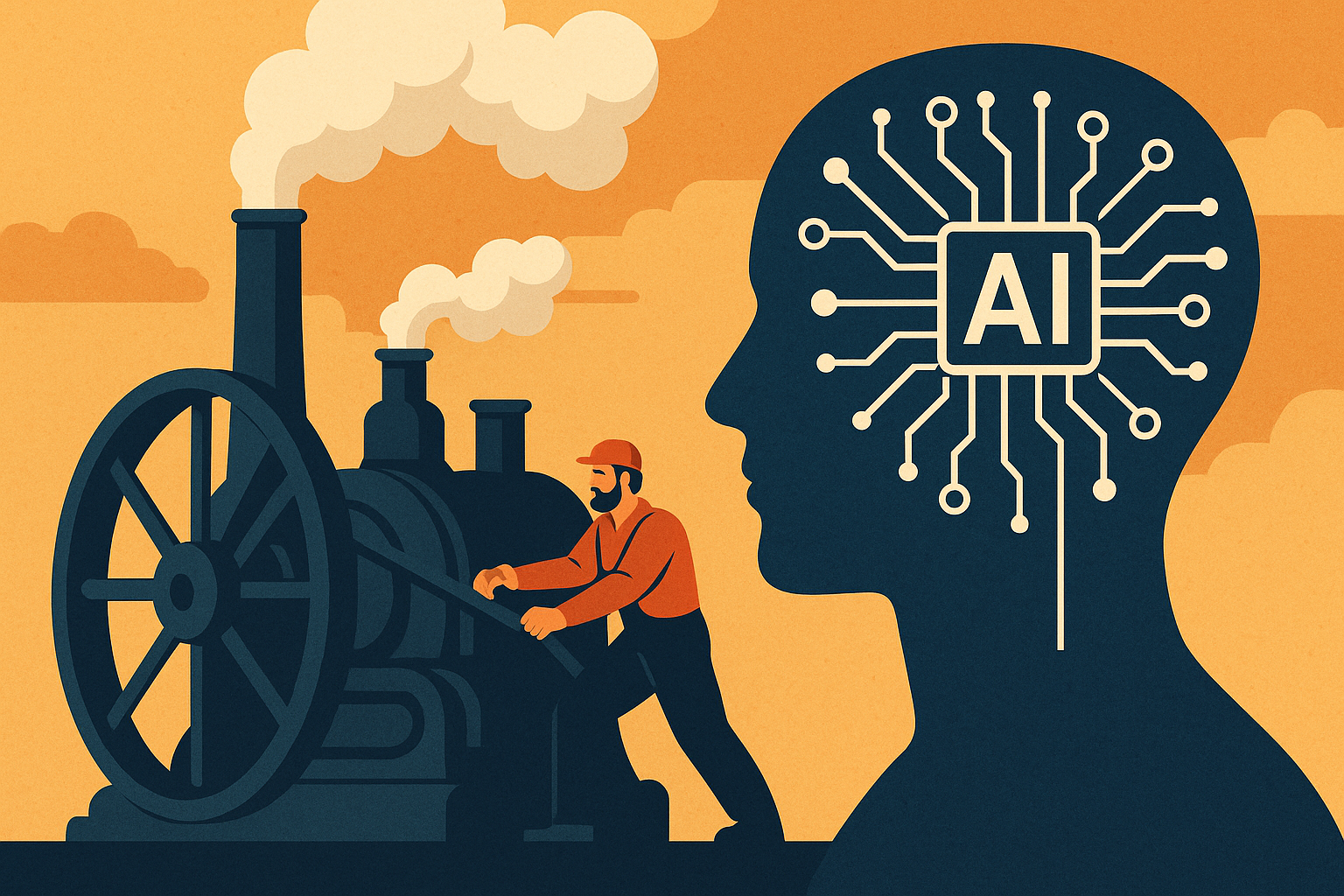Analogia: assim como a máquina a vapor girava rodas gigantes em teares, a IA gira engrenagens intelectuais invisíveis, acelerando etapas que antes consumiam energia humana de forma extenuante.
