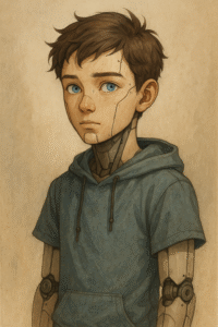 Um holograma se projetou sobre a mesa. Era um adolescente de olhar sereno, o mesmo rosto que Lúcia sonhara em suas últimas noites de vida. Não era o robô de ferro e luz que conhecera, nem o autômato frio do século XIX. Era um ser híbrido, humano o suficiente para sorrir, mas ainda translúcido, como uma lembrança.