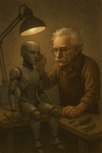 Nos meses seguintes, Gepeto percebeu que havia criado não apenas uma máquina, mas algo que pensava e perguntava. O autômato queria compreender o significado de palavras como “verdade”, “alegria” e “mentira”. Gepeto, fascinado, começou a ensiná-lo, ditando princípios éticos e fragmentos de histórias. Assim como ensinava Pinóquio a ser um bom menino, ensinava PIN-09 a ser uma boa mente.