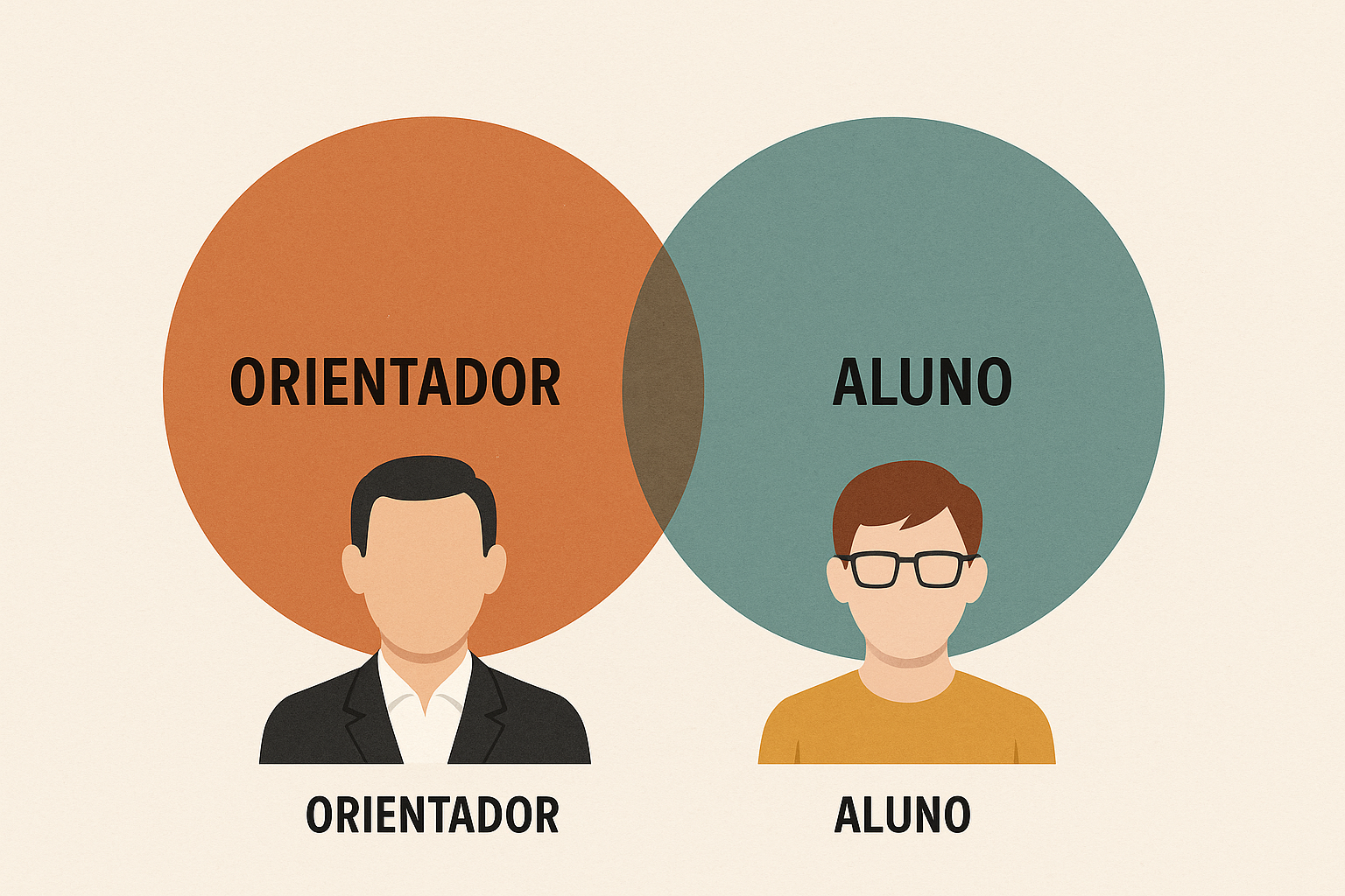 Na primeira imagem, os círculos estão distantes, representando quando orientador e aluno não compartilham interesses. Cada um segue sua rota, sem convergência de propósitos. Essa situação é comum quando o aluno escolhe um orientador apenas pela disponibilidade ou prestígio, sem analisar as linhas de pesquisa. O resultado é previsível: comunicação difícil, desmotivação e sensação de isolamento. A relação existe apenas formalmente, e o processo se torna árduo e desprovido de prazer intelectual.