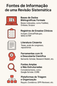 As fontes de informação são fundamentais para a qualidade de uma revisão sistemática. Elas incluem bases de dados formais, registros de ensaios, literatura cinzenta, ferramentas com inteligência artificial, fontes amplas como o Google Scholar e plataformas de triagem, como o Rayyan. Quanto maior a integração entre essas fontes, mais ampla e sensível se torna a busca, reduzindo o risco de omitir estudos relevantes. Além disso, a documentação clara das fontes consultadas garante reprodutibilidade e transparência. Uma seleção cuidadosa e metodologicamente estruturada fortalece a validade dos resultados e produz conclusões mais confiáveis para a prática clínica e científica.
