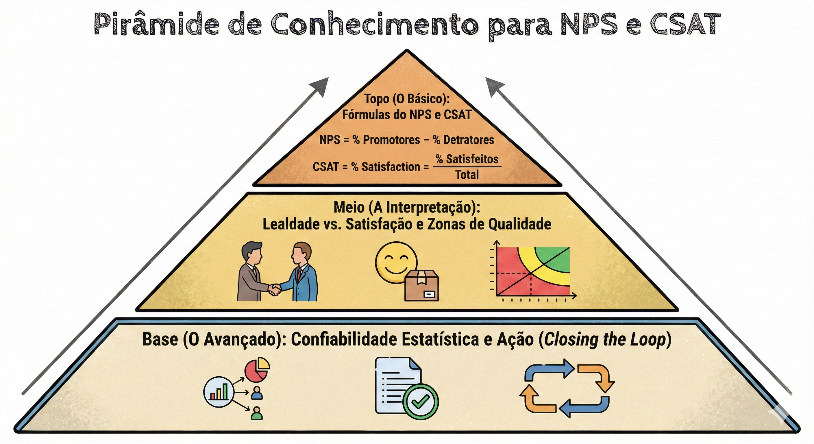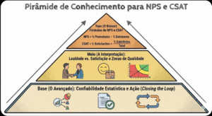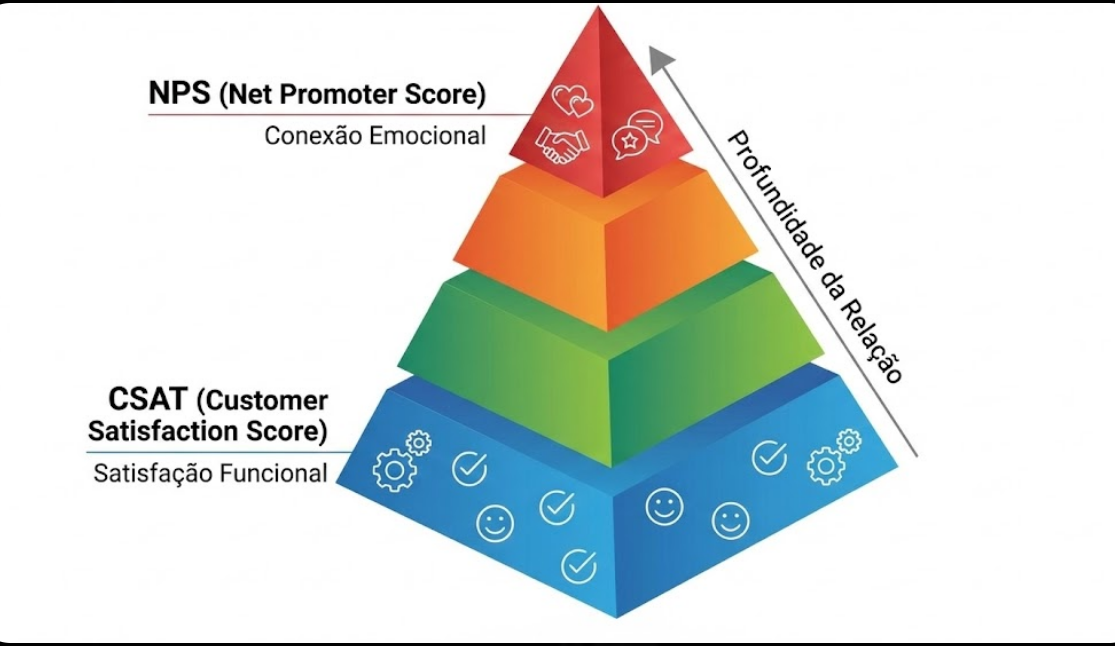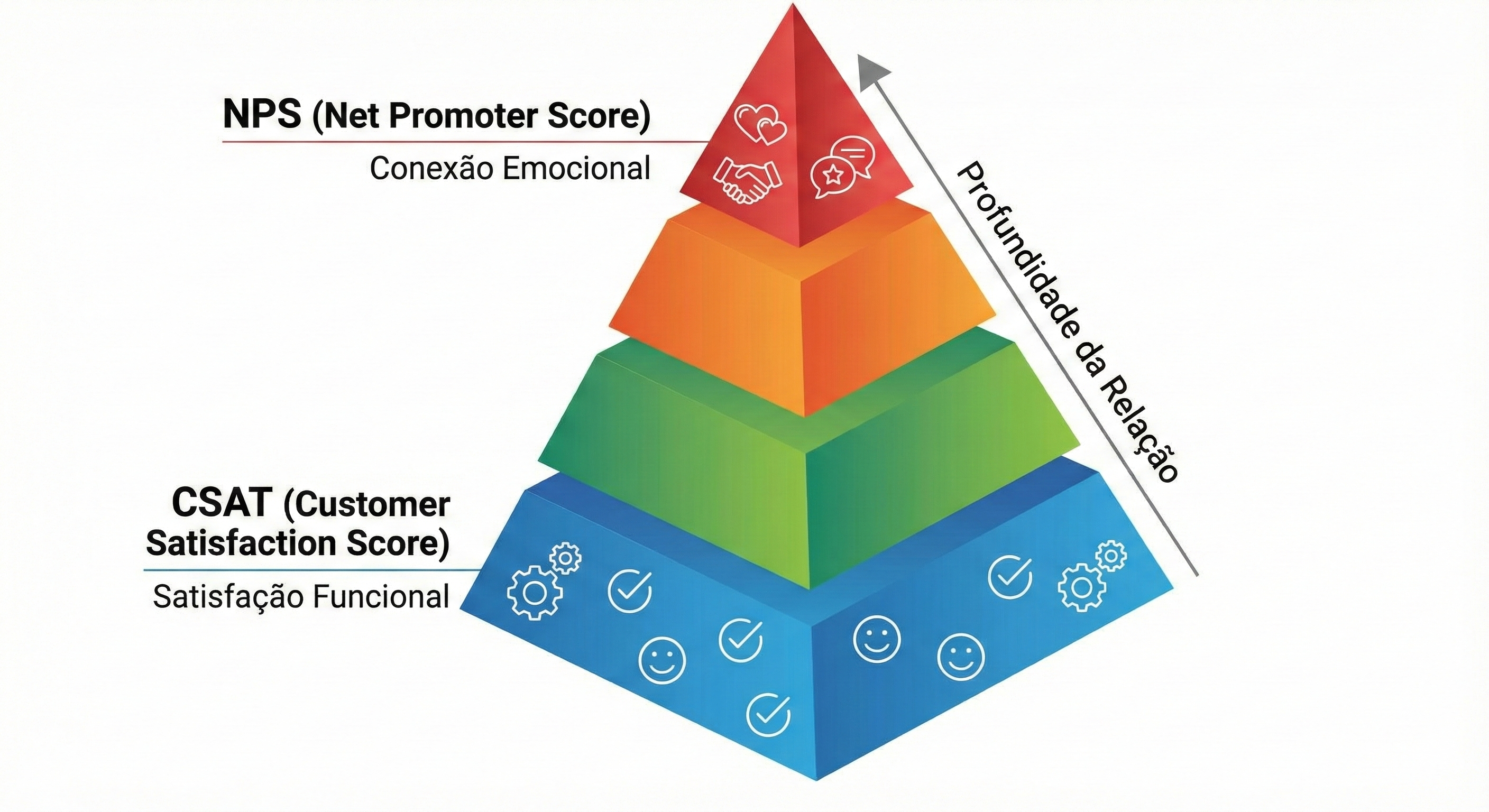 [Imagem Sugerida 1: Infográfico comparativo mostrando uma pirâmide. Na base (CSAT) está a “Satisfação Funcional” e no topo (NPS) a “Conexão Emocional”, ilustrando a profundidade de cada métrica.]