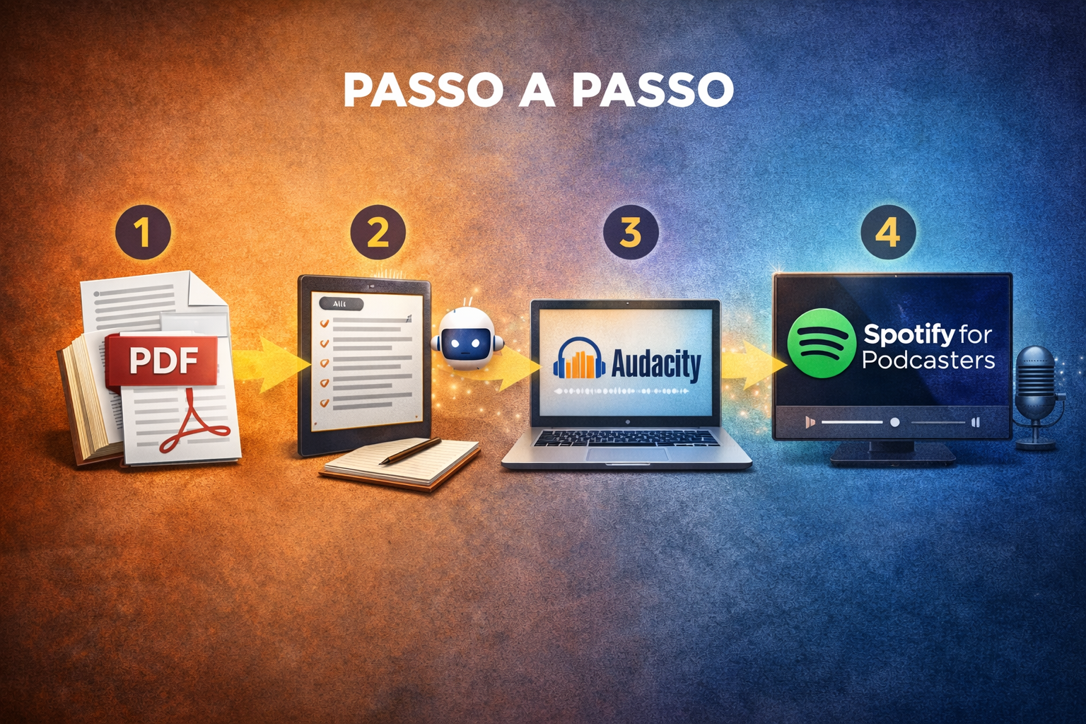 Este roteiro descreve de forma clara e operacional o processo completo para criação de episódios de podcast a partir de capítulos de livros em PDF. O fluxo contempla a preparação do texto, o uso do NotebookLM para geração de áudio, a revisão técnica mínima do arquivo sonoro e a publicação no Spotify for Podcasters. A proposta prioriza eficiência, padronização e qualidade editorial, permitindo a produção seriada de conteúdos educativos com baixo esforço operacional. O método é especialmente adequado para projetos acadêmicos, cursos, livros comentados e iniciativas institucionais que desejam ampliar o alcance do conhecimento por meio do formato áudio.