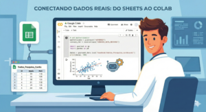 A maior potência do Colab para a pesquisa acadêmica (TCCs e iniciação científica) é a capacidade de ler dados diretamente de onde eles costumam ser coletados: no Google Sheets (Planilhas Google). Isso cria um fluxo de trabalho dinâmico: você coleta dados na clínica pelo celular (Forms/Sheets) e analisa no Colab.