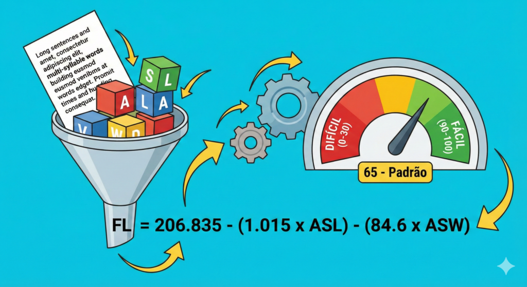 Representação visual da fórmula de Facilidade de Leitura de Flesch, mostrando como o tamanho das frases e das palavras é processado para gerar uma pontuação de legibilidade.