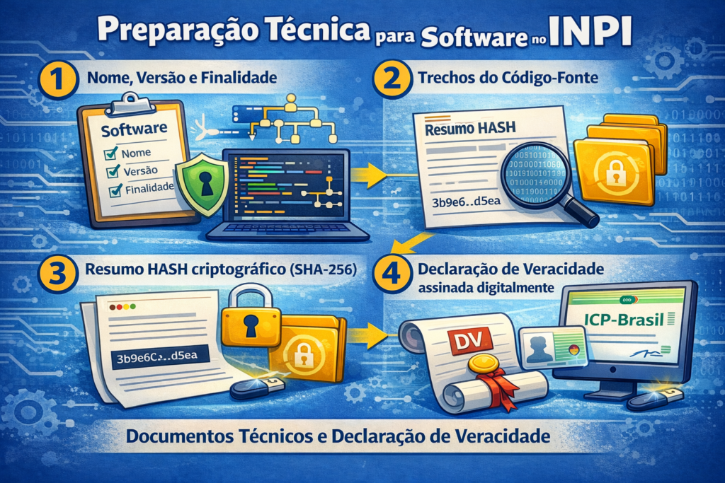 - Resumo digital hash gerado a partir do arquivo que contém o código-fonte. Esse resumo digital deve ser feito com algoritmo criptográfico (ex.: SHA-256), pois o INPI exige apenas a prova hash do conteúdo, não o código visível. (Serviços e Informações do Brasil)