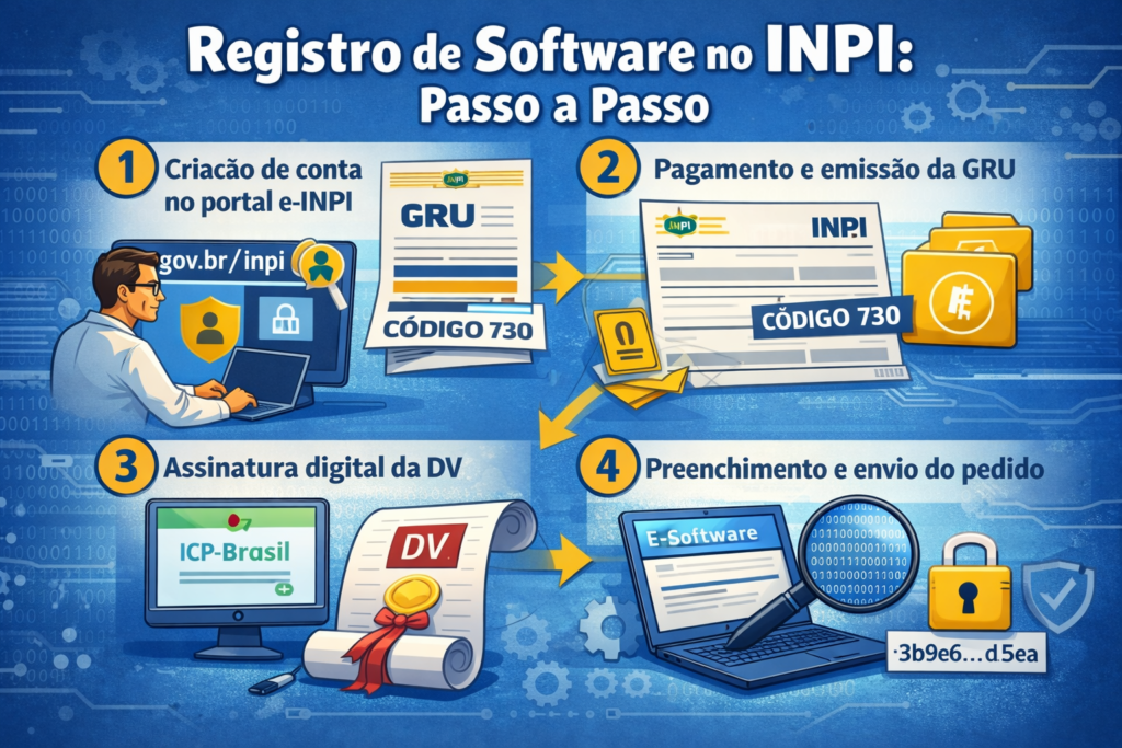 O registro no INPI é um procedimento eletrônico que cria uma comprovação formal de autoria e titularidade de um programa de computador, reforçando a proteção legal do ativo. Não se trata de patente de invenção, e sim de um registro autoral que fortalece direitos jurídicos e comerciais. (Serviços e Informações do Brasil)