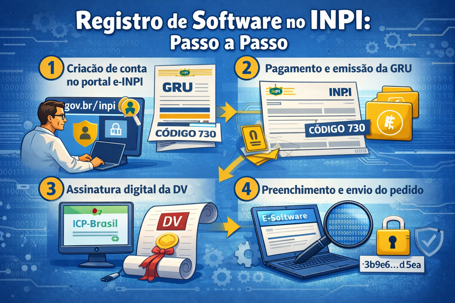 Registrar software no INPI é um processo 100% digital que cria prova formal de autoria e titularidade do seu programa de computador, reforçando a segurança jurídica em disputas ou negociações. O procedimento exige cadastro no sistema e-INPI, geração e pagamento da GRU (código 730), assinatura digital da Declaração de Veracidade, e transformação do código-fonte em um resumo hash, que é apresentado no formulário eletrônico. Após o pagamento e envio dos documentos, o certificado costuma ser emitido em poucos dias. O registro não é patente e não exige divulgação do código-fonte completo.