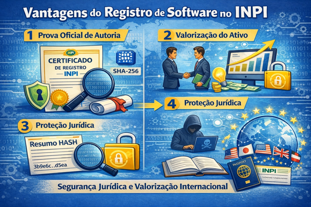 Explica por que registrar seu software no INPI é relevante, listando vantagens como comprovação de autoria, proteção jurídica, valorização do ativo e segurança em negociações. Também esclarece que o registro não expõe o código ao público.