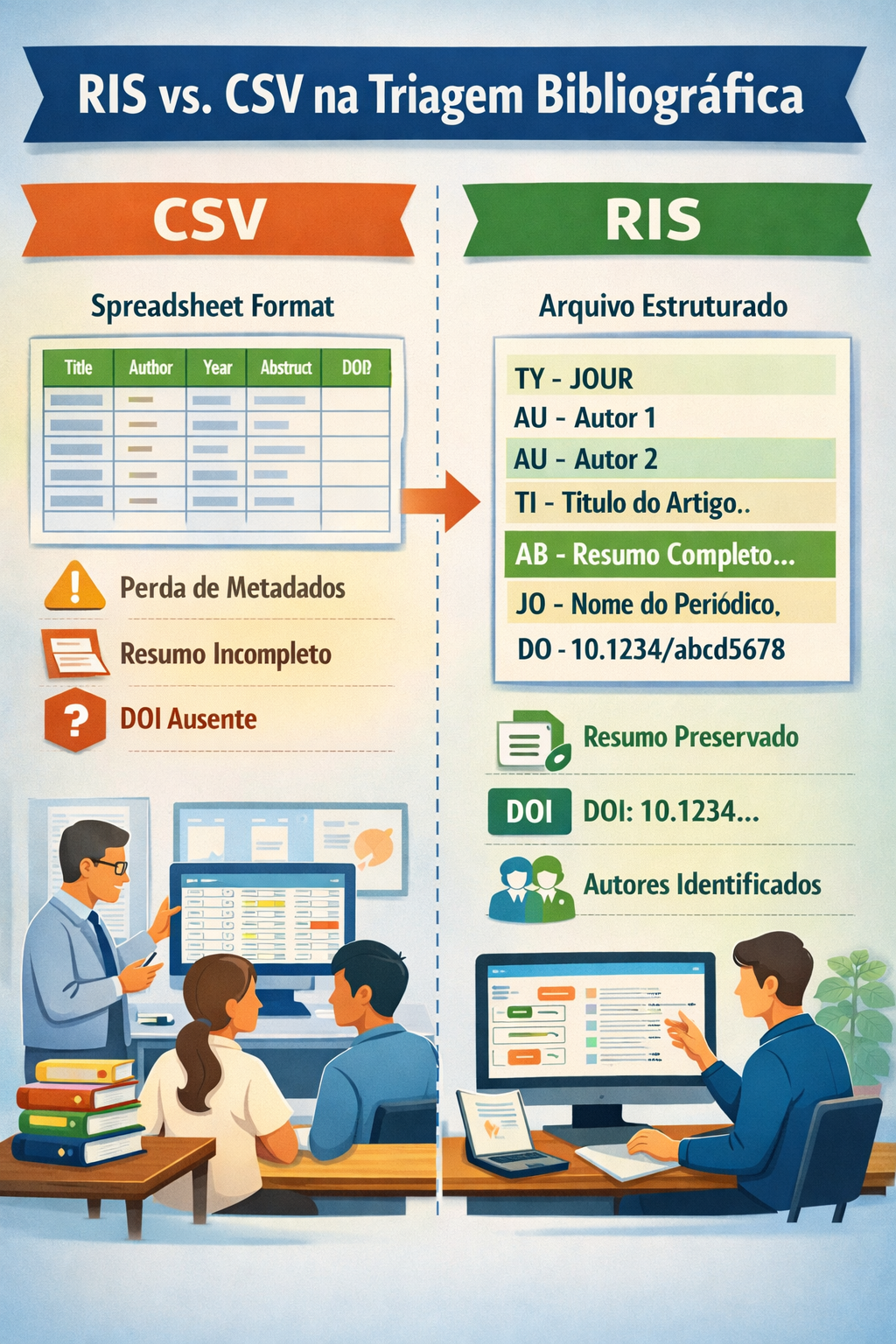 RIS preserva metadados críticos e supera o CSV na triagem acadêmica com Rayyan e revisões