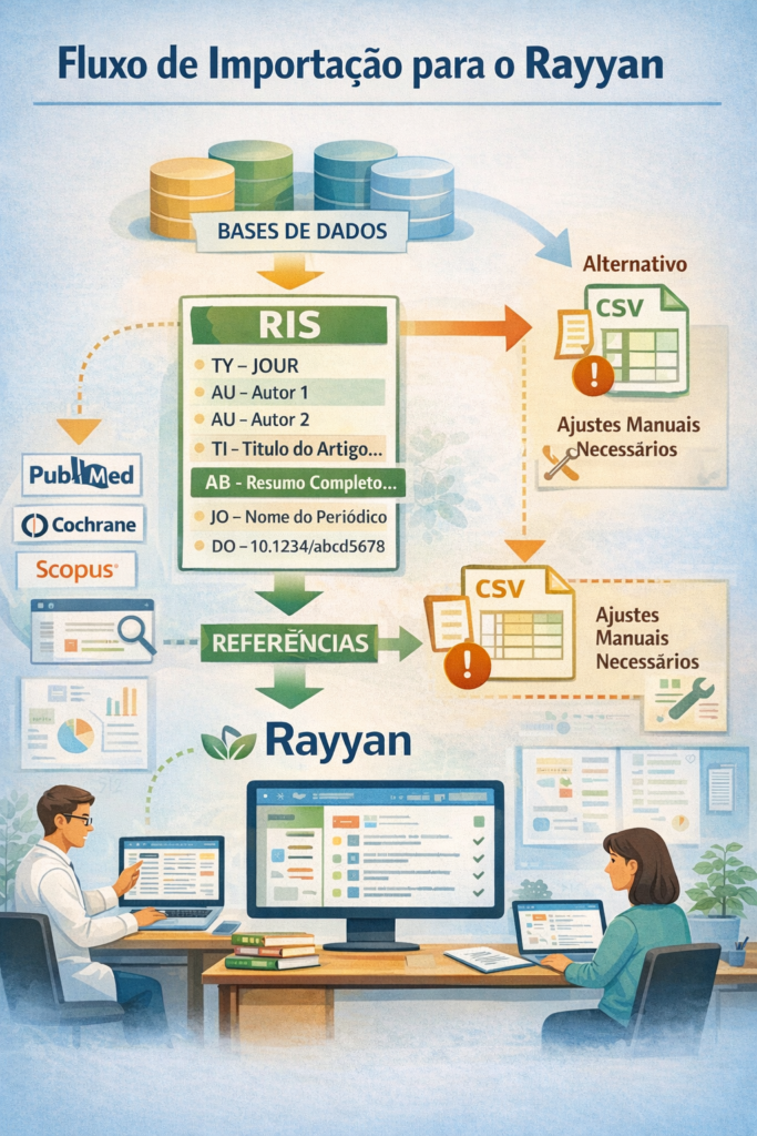 O caminho recomendado, portanto, é: revisar a planilha, padronizar campos essenciais, importar o conteúdo para um gestor de referências e, em seguida, exportar em RIS. Essa conversão não faz milagres: se o resumo ou o DOI nunca estiveram na planilha, eles não surgirão automaticamente. Mas ela melhora significativamente a consistência estrutural dos registros e reduz o atrito técnico na entrada dos dados no Rayyan.