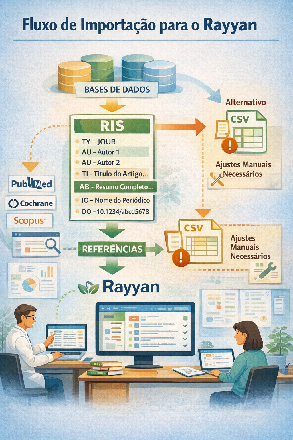 A documentação do Rayyan informa compatibilidade com diferentes formatos, inclusive RIS e CSV. No entanto, ela também mostra uma diferença operacional importante: quando o material só está disponível em CSV, pode ser necessário modificar o arquivo em Excel ou Google Sheets para que ele fique compatível com o padrão aceito pela plataforma. Além disso, o próprio Rayyan orienta que, se houver problemas no arquivo, uma alternativa é abri-lo em um gerenciador de referências e exportá-lo novamente em um formato suportado. Esse detalhe revela que o ecossistema bibliográfico é mais naturalmente alinhado aos formatos especializados, entre eles o RIS.