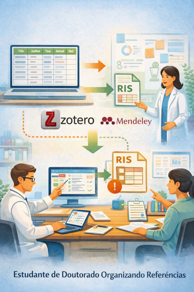 O Mendeley oferece lógica semelhante. Sua documentação informa que o gerenciador permite importar biblioteca por arquivo e exportar referências em RIS. Isso o torna uma ponte útil entre dados dispersos e um arquivo bibliográfico mais compatível com ferramentas de revisão. Em termos metodológicos, o papel desses softwares é justamente reestruturar metadados, organizar tipos documentais e gerar uma saída mais estável para intercâmbio acadêmico.