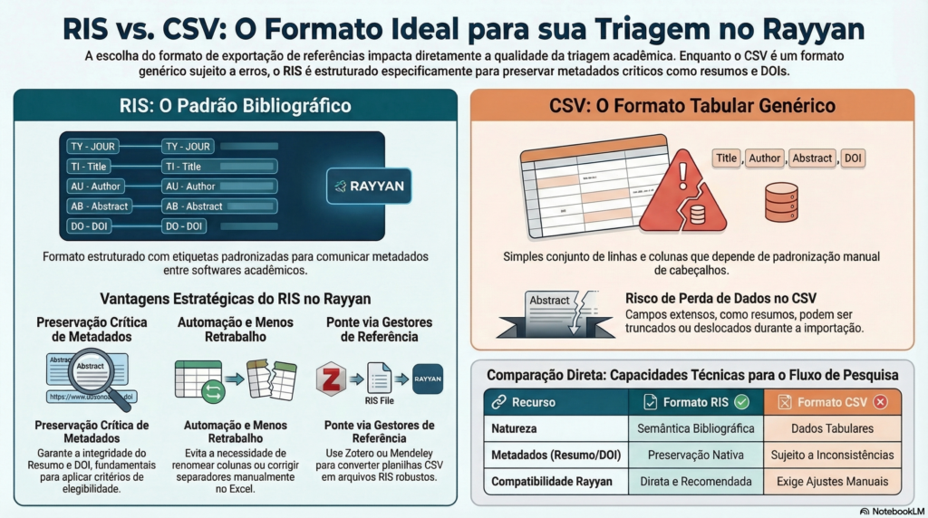 Para quem pretende realizar triagem no Rayyan, a escolha mais segura costuma ser o RIS. A razão principal é simples: ele foi concebido para manter a semântica bibliográfica dos campos, enquanto o CSV depende de convenções locais de cabeçalhos, separadores e organização das colunas. Quando a meta é selecionar estudos com o máximo de automação e o mínimo de retrabalho, preservar resumo, DOI, autoria, ano e periódico deixa de ser conveniência e passa a ser requisito metodológico.