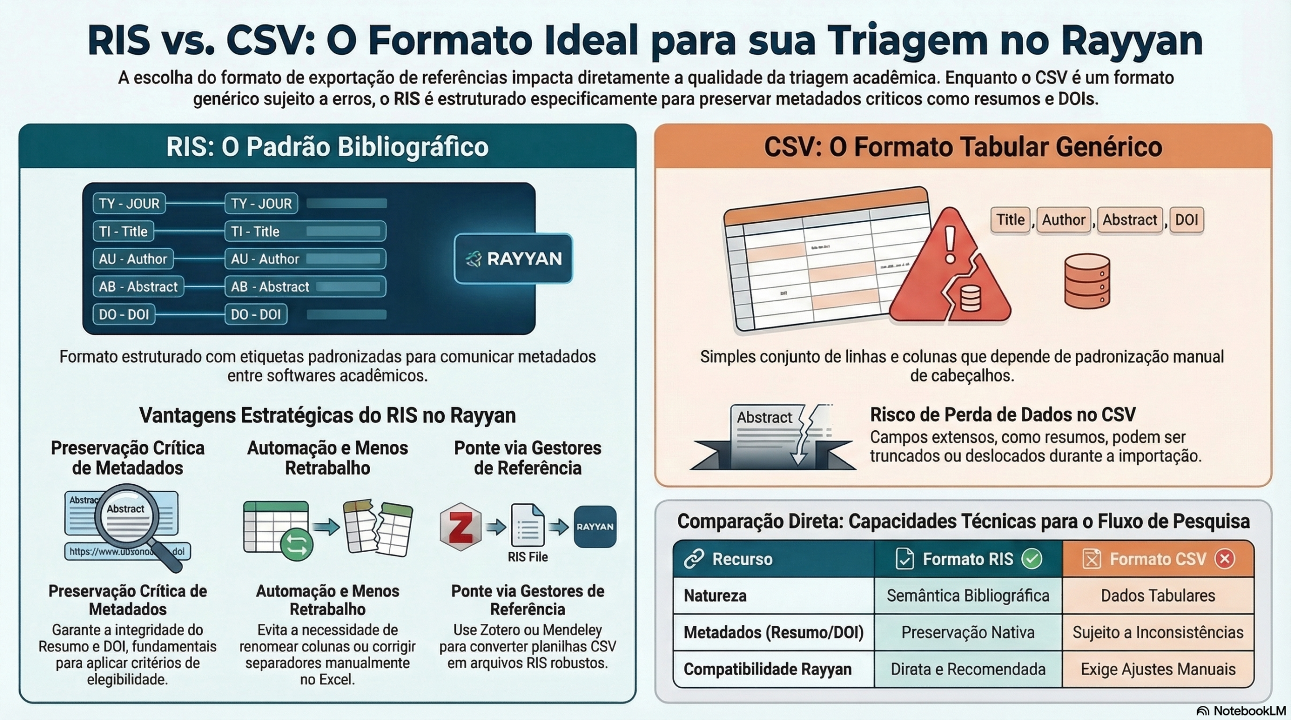 No contexto do Rayyan, essa diferença é especialmente relevante. Embora a plataforma aceite CSV, sua própria documentação mostra que esse formato frequentemente requer ajustes de cabeçalho e separadores. Já o RIS se alinha melhor ao fluxo de importação acadêmica e favorece a manutenção de metadados críticos, como resumo e DOI. Para a triagem de estudos em um doutorado, em que automação, organização e rastreabilidade são indispensáveis, o RIS se consolida como a escolha mais segura e tecnicamente superior.