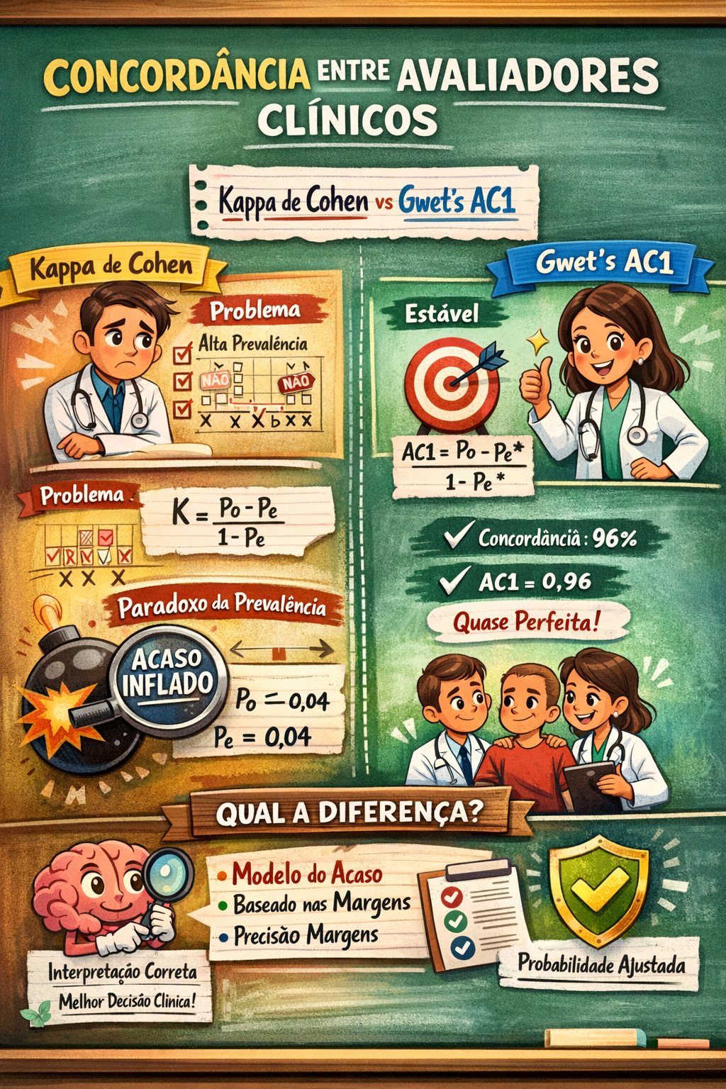 O Kappa de Cohen, embora amplamente difundido, não deve ser utilizado de forma automática e acrítica. Em cenários clínicos reais, onde frequentemente há predominância de uma categoria, como ausência de doença, ausência de complicação ou ausência de infecção grave, o Kappa pode gerar uma falsa impressão de baixa confiabilidade. Isso pode levar à desvalorização de métodos diagnósticos adequados ou à conclusão equivocada de que há inconsistência entre avaliadores.