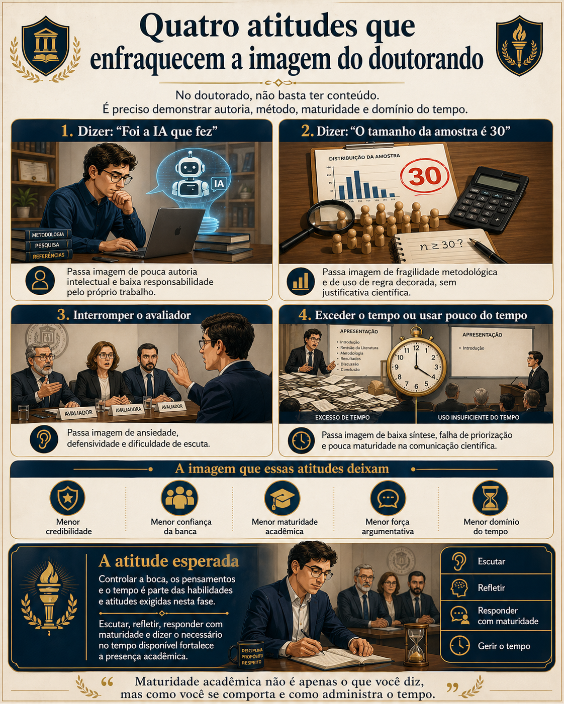 Essas quatro atitudes depõem contra o doutorando porque constroem uma imagem negativa em dimensões diferentes.